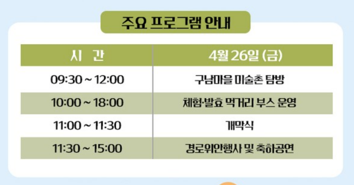 4월 26일 : 구남마을 미술촌 탐방, 체험. 발효 먹거리 부스 운영, 개막식, 경로위안행사 및 축하공연