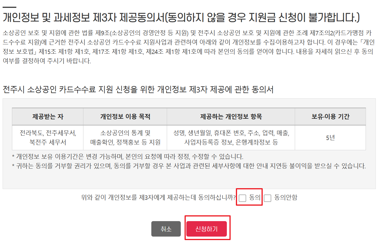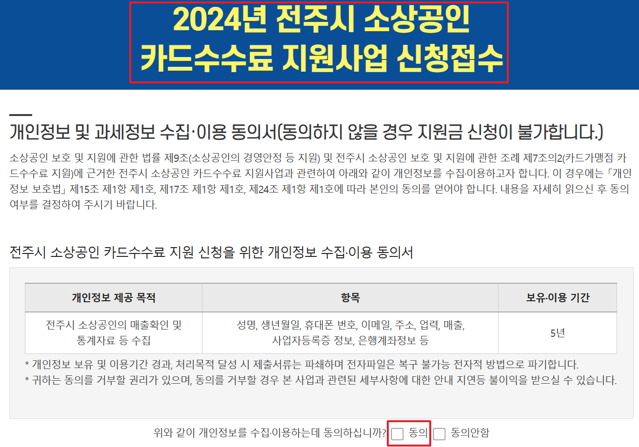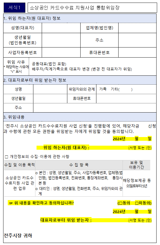 전주시 소상공인 카드 수수료 지원 관련문의 및 통합위임장 서식