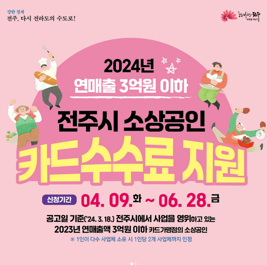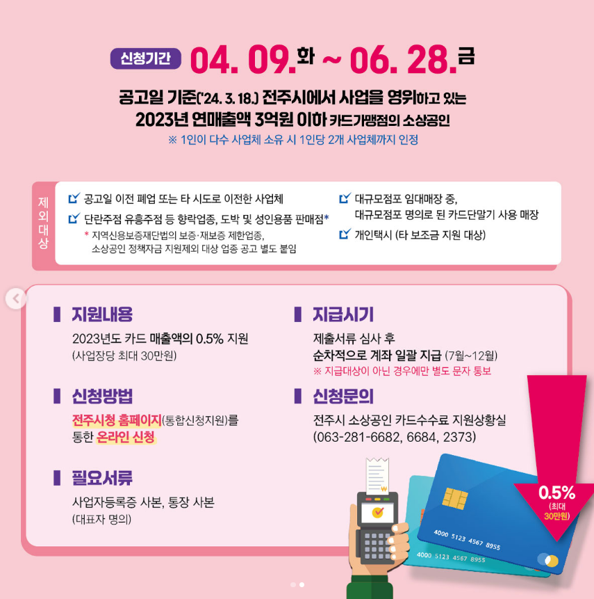 소상공인 보호 및 지원에 관한 법률 제9조 (소상공인의 경영안정 등 지원) 및 전주시 소상공인 보호 및 지원에 관한 조례 제7조의 2 (카드가맹점 카드 수수수료 지원)에 따라 전주시 소상공인들의 경영부담 완화를 위한 2024년 소상공인 카드 수수료 지원 사업을 다음과 같이 시행합니다.