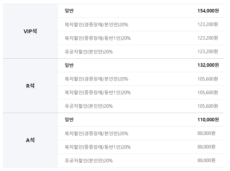 공연금액 : VIP 일반 154,000원 / R석 132,000원 / A석 110,000 (예매 수수료 장당 2,000원)
